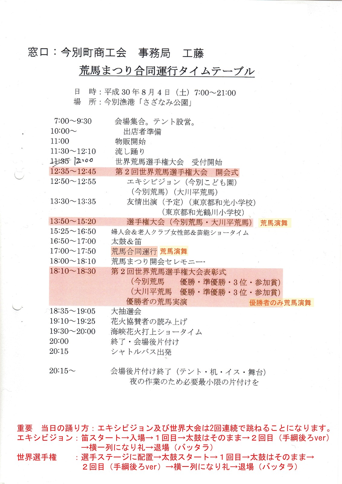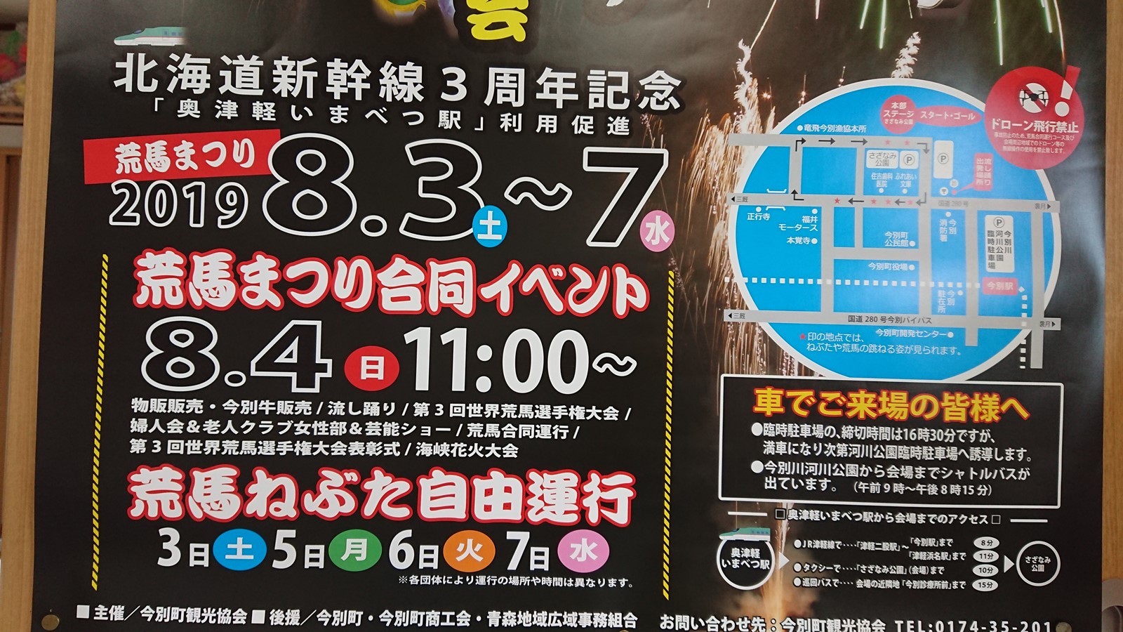 今別町HPリンク https://www.town.imabetsu.lg.jp/news/kankou/2019-0605-1825-1.html 今年で3回目になりました、世界荒馬選手権大会! 言ってるもんですね~。。 世界って響きにあまり違和感がなくなってきました(笑) 慣れってのは恐ろしいものです。。 上記のリンクから詳細ご覧になれますので、ご確認ください! 応募用紙についてもそちらにあります! ちょっと、参加資格見てて気になった点が。。 過去の大会で優勝されたペアは辞退していただく。 ただし、相手方を変えた場合は参加可能! なるほど~。 優勝したペアの方々は、新たなペア探しが必要なんですなぁ。。 ま、ま、ま、ま、まぁ、今回はこのまま行きましょう。 ペア探しに支障が出た等ありましたら、教えてください。 または、今別町商工会へお知らせください。 今後の参考に致します。 詳細なタイムスケジュール等はまだ出ていませんので、 参考までにH30年度のタイムスケジュールのせておきます。 あくまで参考までに!