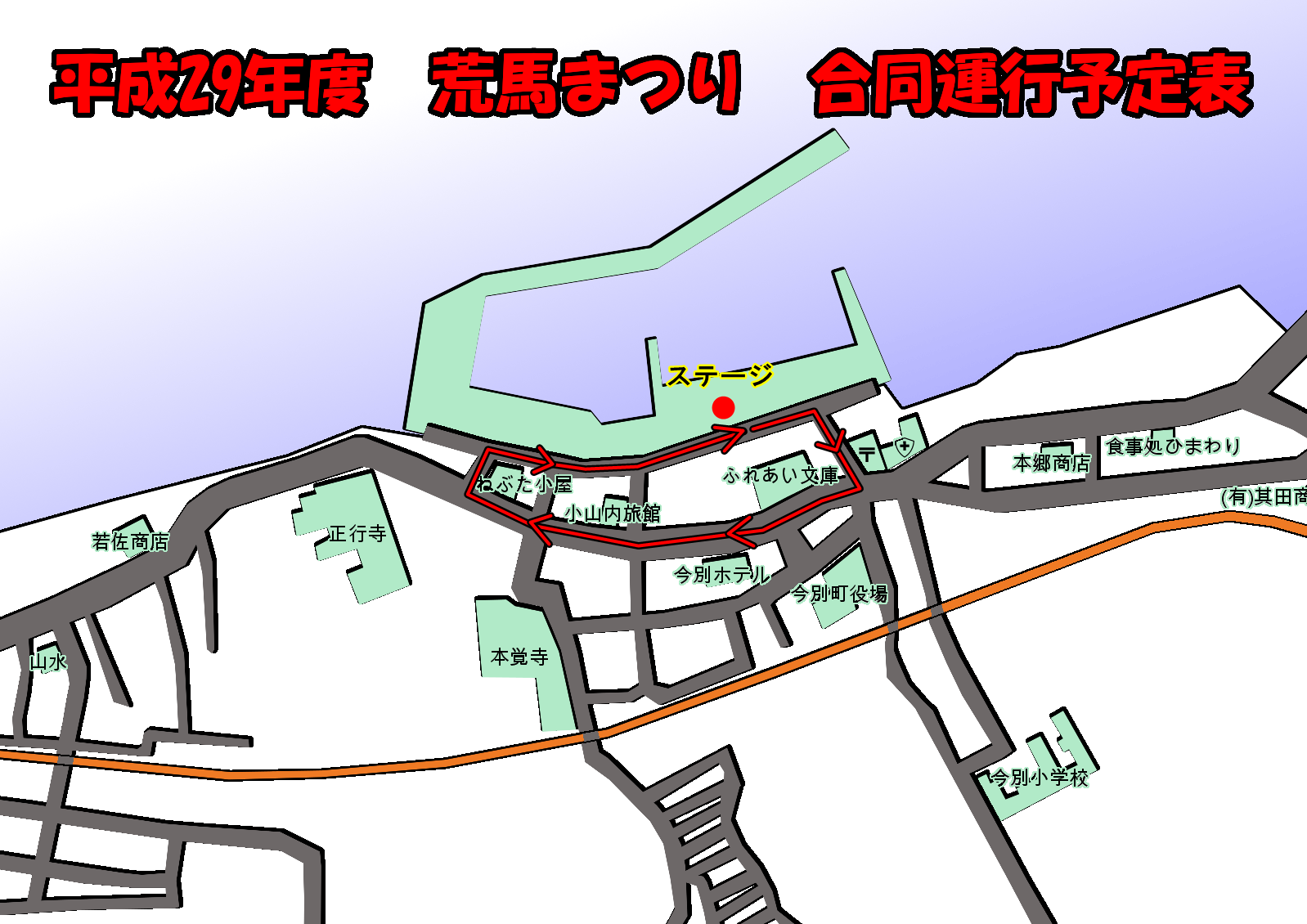 今年の合同運行はコースが違いますよ! 大変コンパクトになりました! 荒馬まつり会場のステージ前を出発しまして、 グルっと回って、ステージ前で終了になります。 合同運行中は、郵便局付近から正行寺付近まで 完全通行止めになります。(16:30~18:30) この時間帯には、車両による会場への出入りも規制されますので ご注意下さい。 実際には、運行が終わり次第解除になりますので、 17:30頃までには解除になると思います。 ですので、合同運行に参加したい方々は、 会場もしくはねぶた小屋へお越しいただければと思います。 お間違いにならないよう、ご注意下さい!